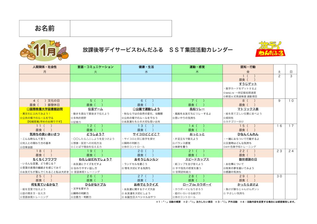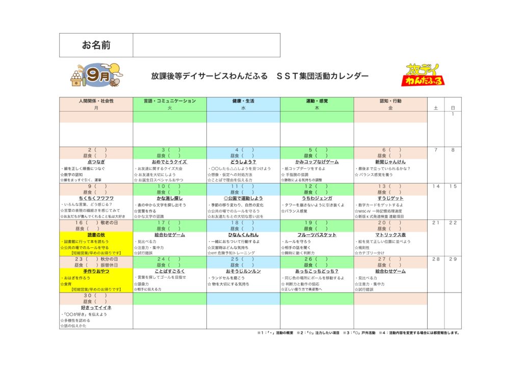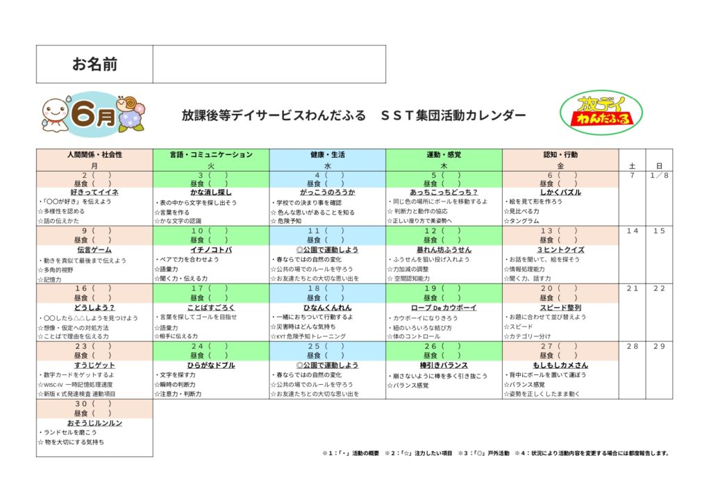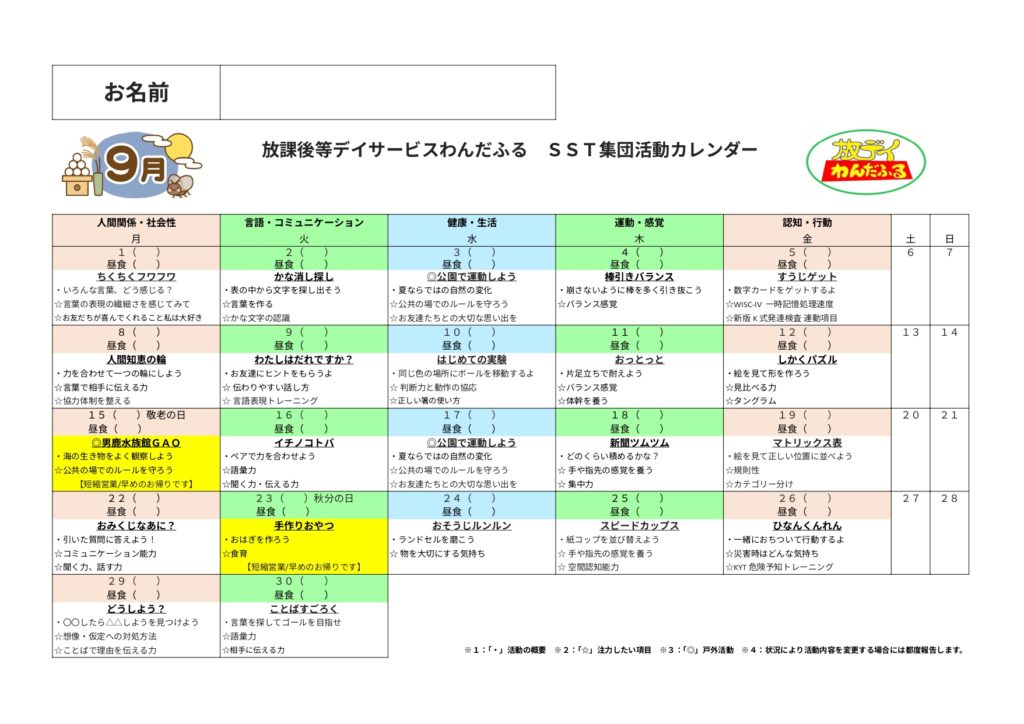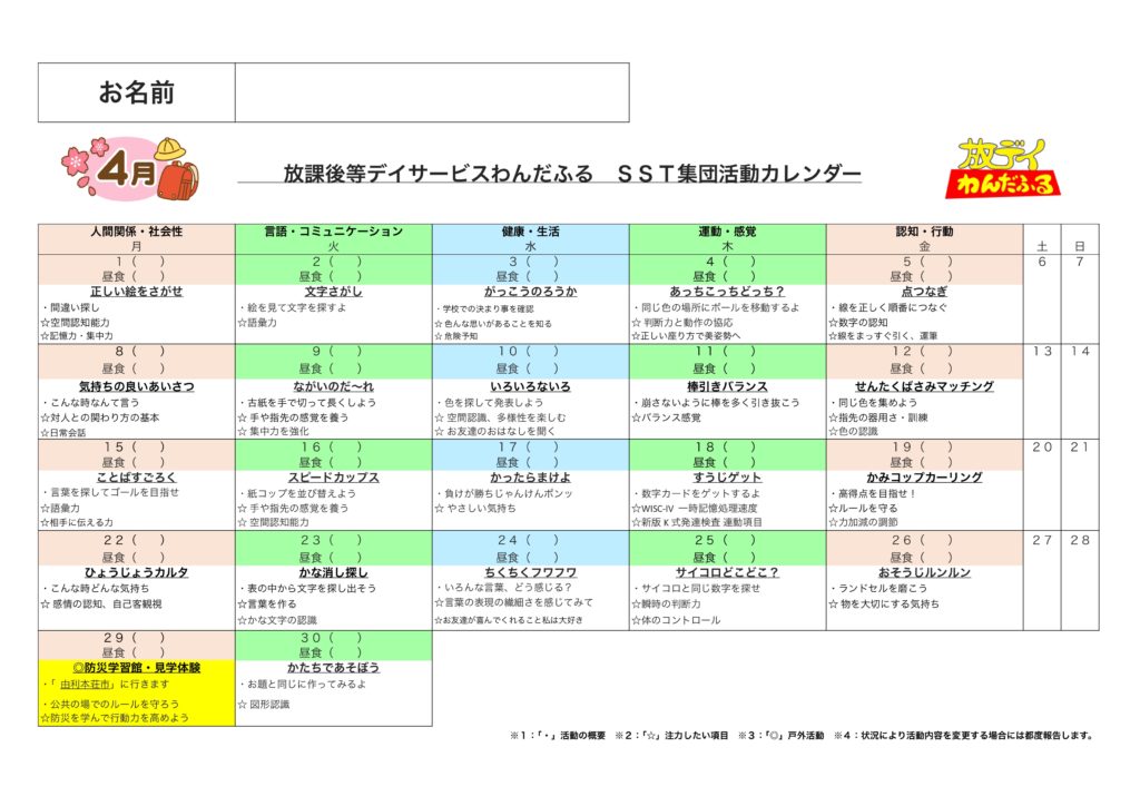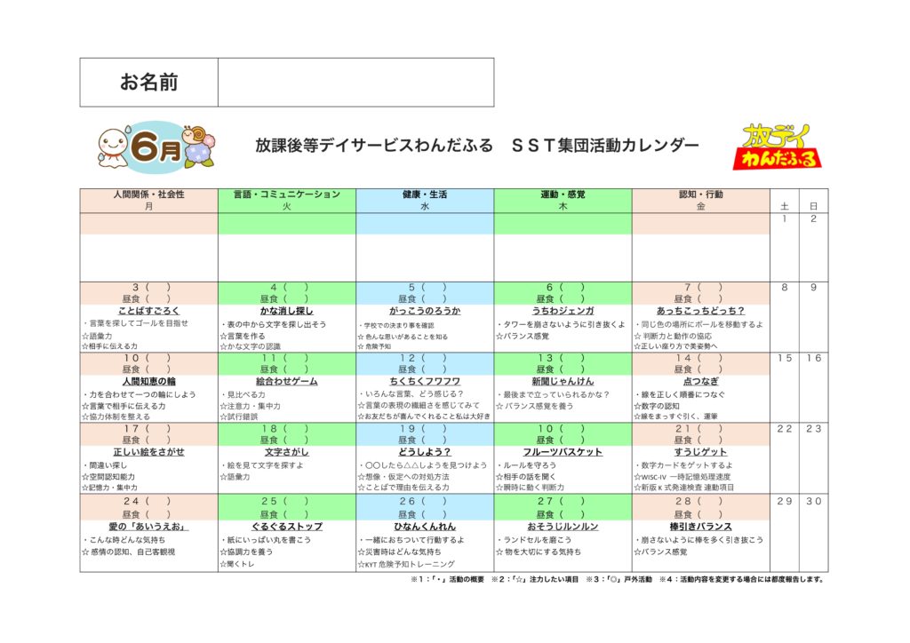 WISC-Ⅳ,WISC-Ⅴ,新版K式発達検査(各年),S-M社会生活能力検査,改訂版標準読み書きスクリーニング検査(STRAW-R),絵画語彙発達検査(PVT-R)を基にしたSST集団活動を提供しています。6〜10歳児の能力検査値の児童が対象となります。