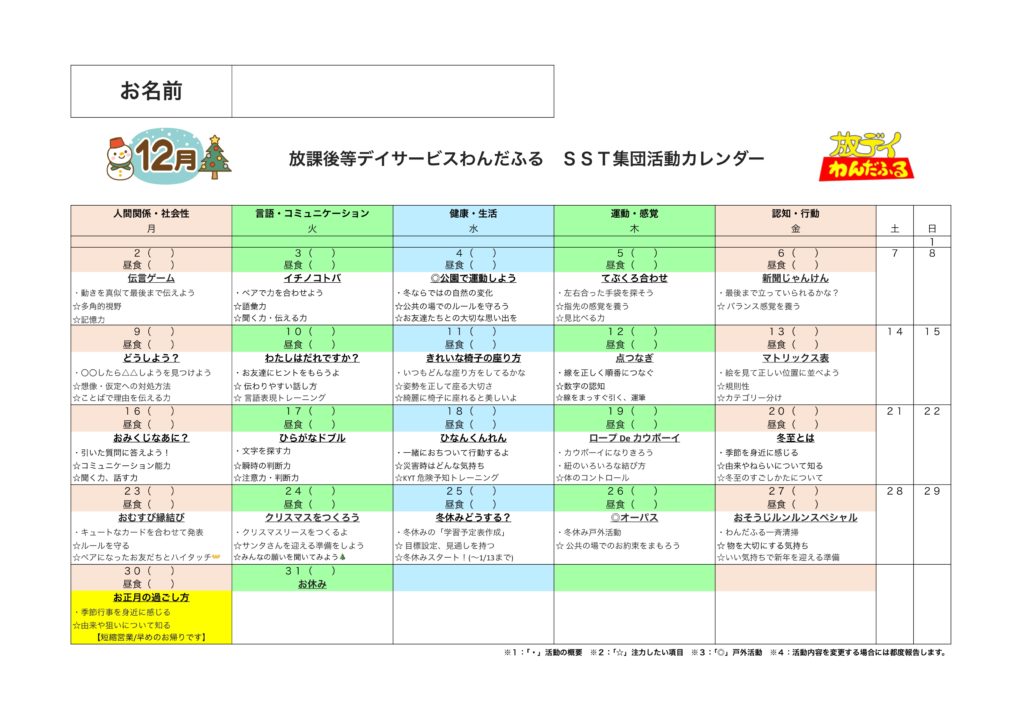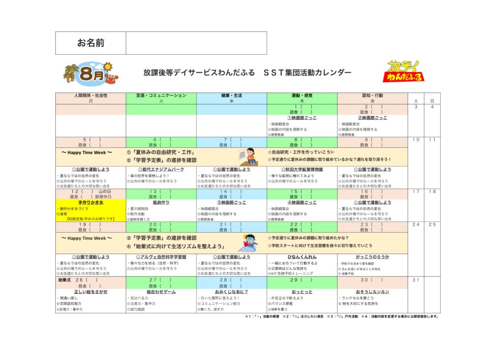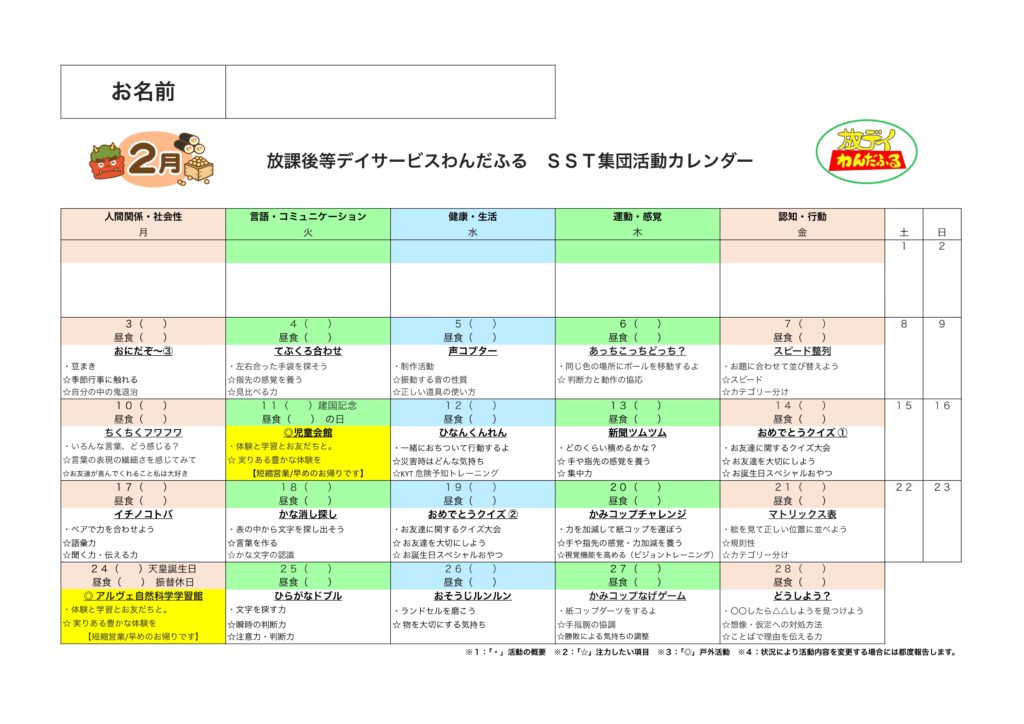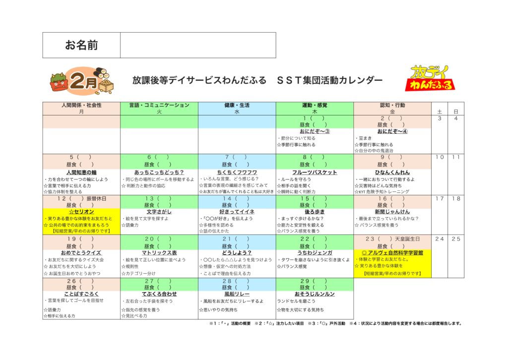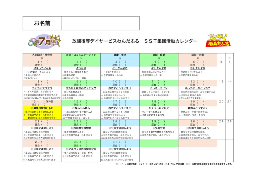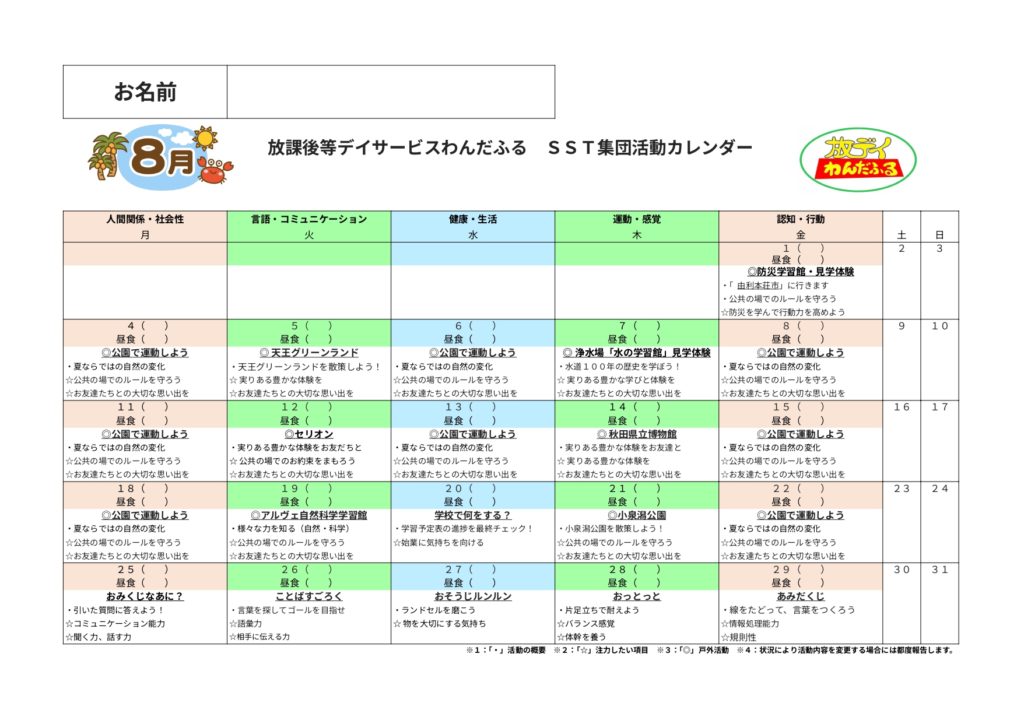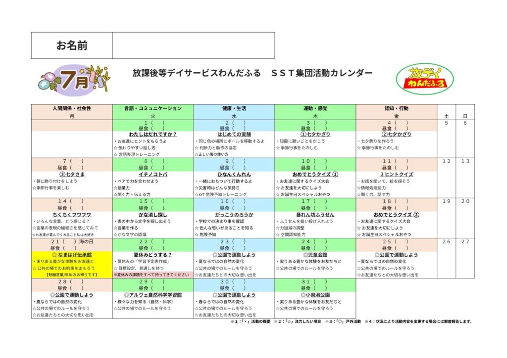 WISC-Ⅳ,WISC-Ⅴ,新版K式発達検査(各年),S-M社会生活能力検査,改訂版標準読み書きスクリーニング検査(STRAW-R),絵画語彙発達検査(PVT-R)を基にしたSST集団活動を提供しています。6〜10歳児の能力検査値の児童が対象となります。